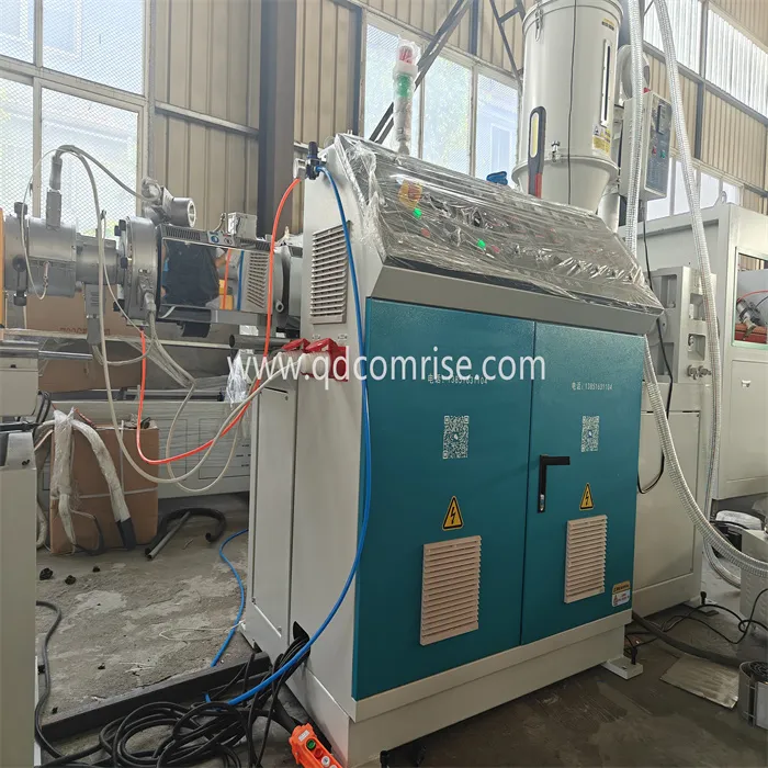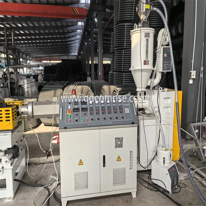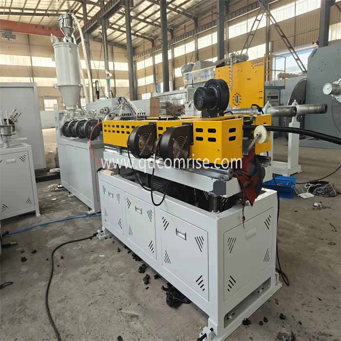 Potrubie vstupuje do zvlniteľa, kde je tvarované do vlnitej profilu pomocou blokov foriem a vákuového tlaku.